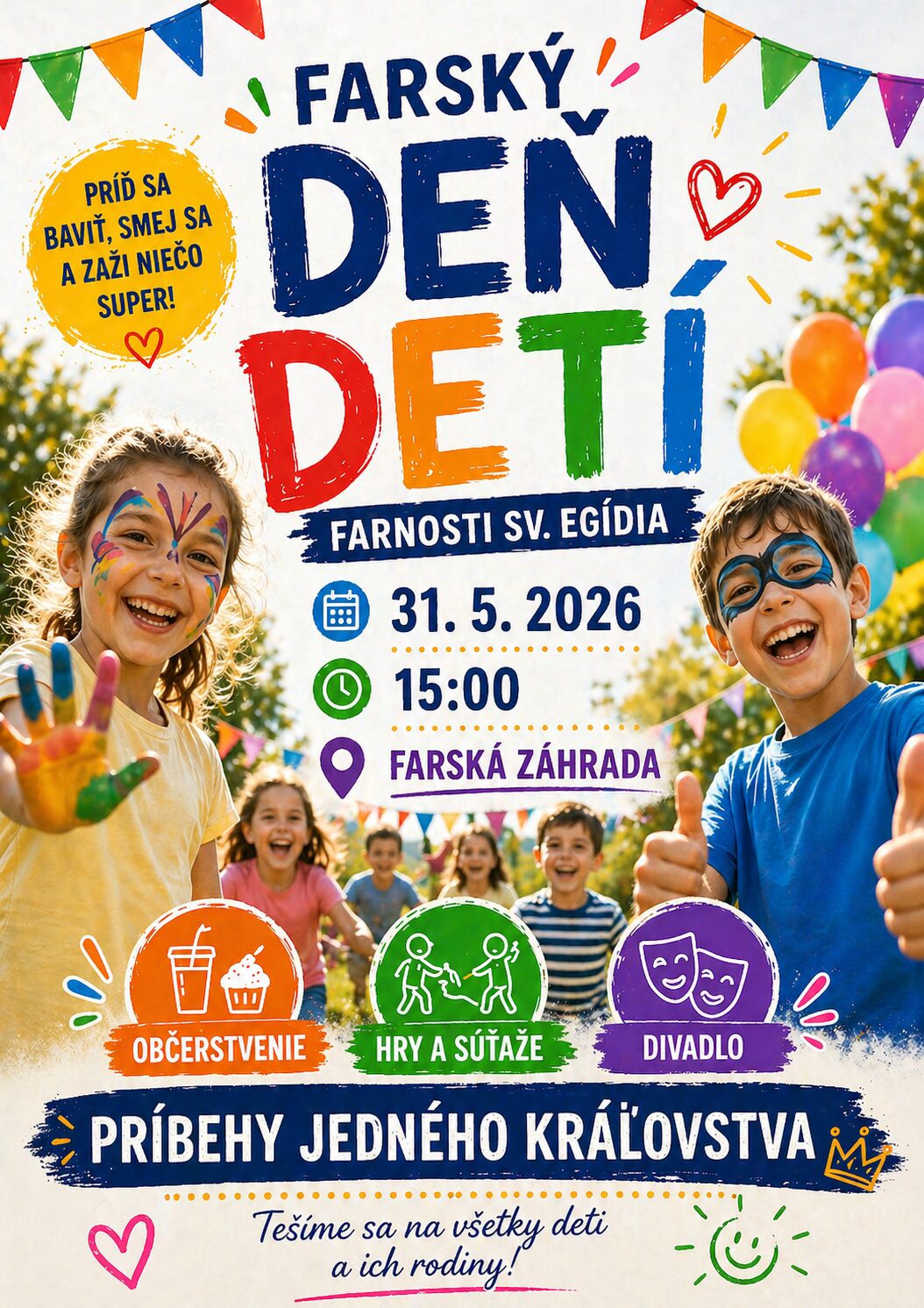 Srdečne vás pozývame na Farský deň detí Farnosti sv. Egídia, ktorý sa uskutoční 31. mája 2026 o 15:00 vo Farskej záhrade.
